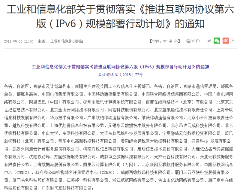 根據中辦、國辦下發(fā)的《行動計劃》和工信部下發(fā)的《通知》:2018年末,省級政府網站,央企網站和新聞媒體網站全部改造支持IPv6;2020年末,市級政府和新聞媒體和工業互聯網應用支持IPv6。...