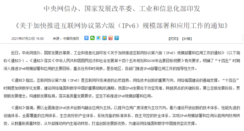近日,中央網信辦、國家發(fā)展改革委、工業和信息化部印發(fā)《關于加快推進互聯網協議第六版(IPv6)規(guī)模部署和應用工作的通知》(以下簡稱《通知》)。《通知》落實《中華人民共和國國民經濟和社會發(fā)展第十四個五年規(guī)劃和2035年遠景目標綱要》有關要求,明確了“十四五”時期深入推進IPv6規(guī)模部署和應用的主要目標、重點任務和時間表,是各地區、各部門推進IPv6部署應用工作的指導性文件。《通知》指出,互聯網協議第...